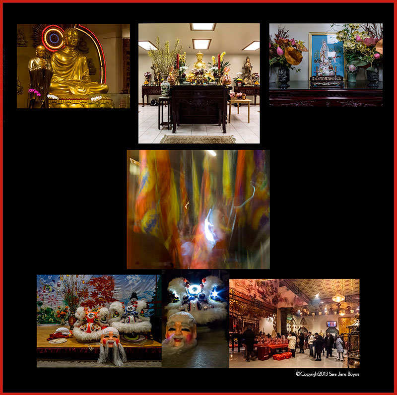 QUAN AM BUDDHIST FELLOWSHIP is directly across from Waken Temple and the World I-Kuan Tao Headquarters. It was not at first apparent that this was a temple and we almost drove by it however as we noticed others visiting, we parked again. Thus we entered a former small house from the back driveway, the rooms saturated with the scent of flowers and overwhelming visual treats. Altars, tables and walls were filled with gold Buddha’s (including the red Buddha, the Laughing Buddha and many others that serve to protect the space and tradition), photographs, flower vases containing symbolic flowers (yellow chrysanthemums throughout), carpets on top of carpets. and monks and Master in attendance, greeting each who entered. The Fellowship appears to follow Vietnamese/Chinese cultural norms. A kitchen where the New Year's Day vegetarian meal was being prepared and a garden/nursery were behind.